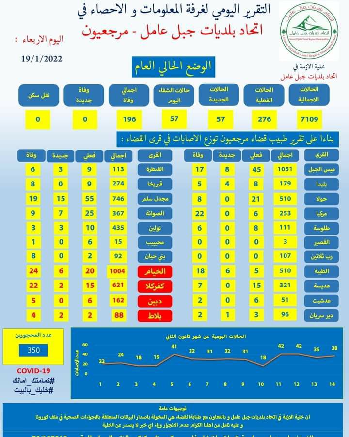 ملاحظة : ان خلية الازمة في اتحاد بلديات جبل عامل بالتعاون مع طبابة القضاء هي المخولة باصدار البيانات المتعلقة بالاجراءات الصحية في ملف كورونا