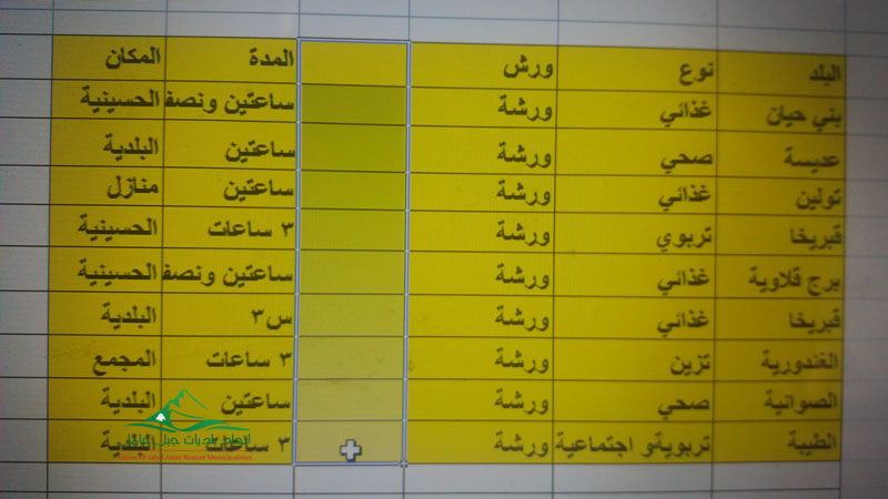 في إطار الخطة الصحية لاتحاد بلديات جبل عامل وبالتعاون مع هيئات المجتمع المدني والبلديات ,أقيم عدد من الورش في مجالات (الصحة النفسية , العناية بالبشرة , الغذاء الصحي,الحساسية عند الأطفال ..) وقد شملت هذه الورش عدد من قرى الاتحاد.