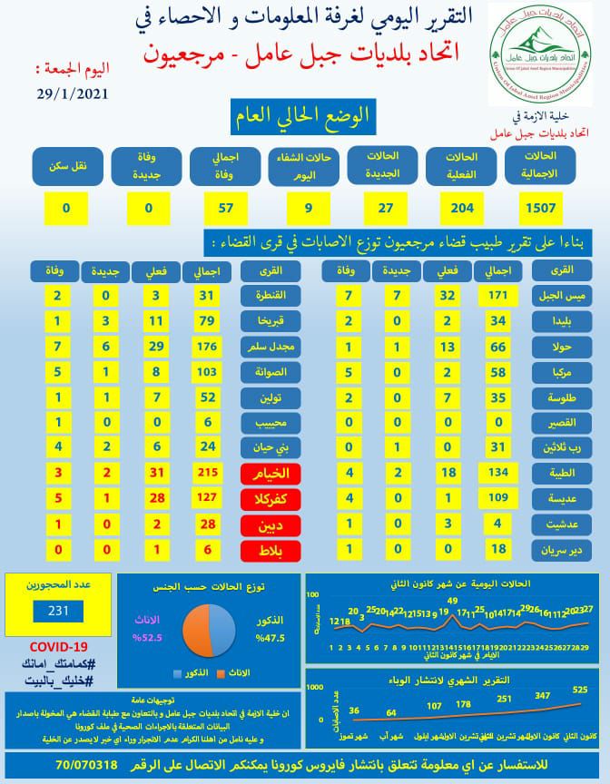 التقرير اليومي الجمعة 29-1-2021 الصادر عن خلية الازمة في إتحاد بلديات جبل عامل - مرجعيون